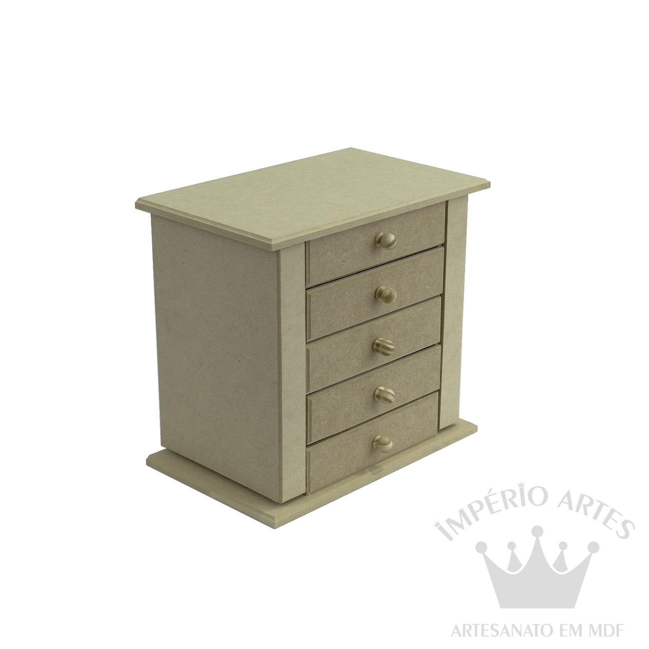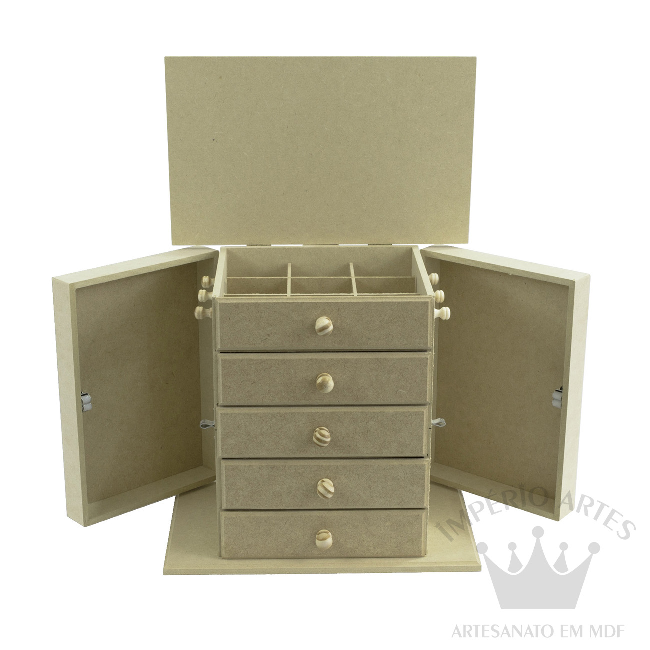 – Nossos produtos são feitos na sua maioria em MDF Crú e todos são enviados sem acabamentos em pintura.